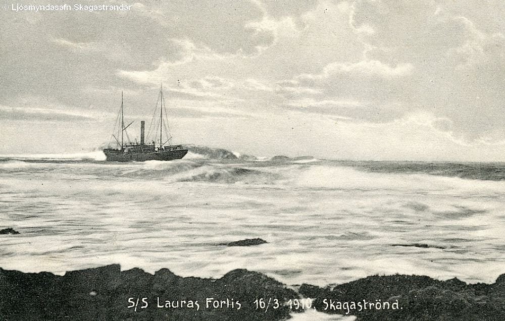 Millilanda- og Strandferðaskipið Laura - Lára - á strandstað á Bótinni, í mars 1910. Allir björguðust en skipið brotnaði á strandstað því ekki tókst að draga það á flot aftur. Í baksýn sér í norðanverðan Höfðann. Svo vildi til að Guðrún Teitsdóttir (d. 17.6.1978) ljósmóðir í Árnesi - Guðrún ljósa - var farþegi með skipinu í þessari síðustu ferð Lauru. Hér fyrir neðan fer frásögn Guðrúnar af strandinu en frásögnin er tekin af vefsíðu sem afkomendur Guðrúnar hafa sett út á netið, (ljosmodir.wordpress.com/amma-hefur-ordid/). Myndina tók Evald Hemmert. LÁRUSTRANDIÐ"Haustið 1909 fór ég til Akureyrar til að læra að sauma. Ég hélt til hjá Valgerði Ólafsdóttur frænku minni. Hún bjó hjá syni sínum Halldóri. Hún kom mér fyrir hjá konu sem kenndi saumaskap. Og var ég þar í 6 mánuði. Mér langar mjög mikið til að læra dönsku því frænka mín var alltaf að lesa dönsku. Kom hún mér þá fyrir hjá Jórunni Sigurðardóttur sem hafði kvennaskóla og tók hún mig í dönskutíma og hafði ég gott af því. Svo fór ég heim í mars með gömlu Láru. Gekk það allt vel þar til við komum inn í Húnaflóa. Þar var hríðarveður. Stýrimaður kom inn til okkar stúlknanna um morguninn og sagði okkur að við skyldum liggja í rúminu þar til við kæmum til Skagastrandar um hádegisbil. Kojurnar okkar voru inn af matsalnum en í honum sátu 13 Fransmenn sem höfðu brotið skip sitt fyrir austan land og voru nú á leið suður. Svo þegar skipið fór að taka niður þá fór að heyrast í körlunum og bar mest á orðinu „malestia“ sem mér var sagt að væri svart blótsyrði og er það eina orðið sem ég kann í frönsku. Við þurftum að drífa okkur í fötin því skipið hallaði gífurlega. Og fórum upp á þiljur þá var skipið strandað og hvítfrissandi bárur allt í kring. Við sáum til lands framundan og okkur var sagt að við hefðum strandað fyrir utan höfðann á Skagaströnd. Svo voru settir út tveir bátar og vorum við stúlkurnar settar ofan í annan bátinn ásamt öðrum. Og kom fyrsti stýrimaður og settist undir stýrið svo var lagt af heimleiðis. Ferðin tók klukkutíma og var það köld ferð. Við komumst upp í víkina fyrir sunnan Hólanes og brutumst þar upp í gegnum mikla skafla. Svo var mér fylgt út á bæ til móðursystur minnar Maríu að nafni og bjó hún í Viðvík. Hún var móðir Gísla sem var faðir Snorra og Snorri er faðir Gísla sem þú þekkir. Fékk ég þar ágætis viðtökur og var þar um nóttina." |